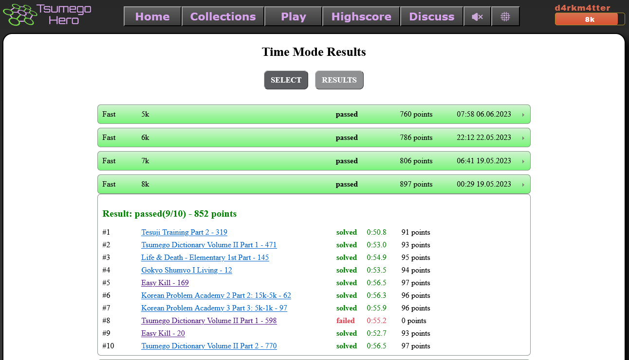 In the time mode, you are challenged with 10 problems of a selected rank. If you solve enough of them correctly,